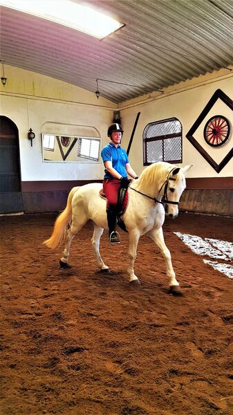 Eftersom jag skulle rida lektion själv, åt jag frukost före de andra, redan klockan 08.00. Jag var sedan nere vid stallet redo för min ridlektion vid 09.00. Jag skulle få rida Olé, en Arab/Lusitano-valack som var högt utbildad inom dressyren. Han var smäcker och elegant. Man kände sig verkligen privilegierad att få rida en sådan erfaren dressyrhäst. Och att få träna för Rodrigo Ferreira som inte bara såg bra ut, utan även hade ett väldigt fint leende. Det gick från öra till öra och man kunde inte låta bli att le tillbaka. Man blev verkligen på gott humör när man såg honom.