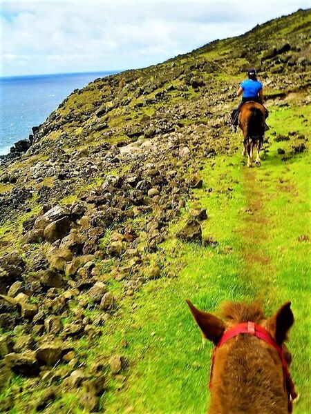 Så fort vi lämnat bebyggelsen i Hanga Roa och red ut på mer ensliga vägar kunde vi höja tempot. Efter långa sträckor med trav och galopp övergick landskapet i ett mer kargt, stenigt och öppet landskap. Det märktes att hästarna var säkra på ”fötterna” och sicksackade fram lätt och ledigt mellan lavastenarna. Det var inte så många moai längs vägen som vi red utan mer fornlämningar som hus, gömställen och grottor, arkeologiska fynd som målningar och hällristningar. På ett ställe satt vi av hästarna och gick fram till ett gömställe.