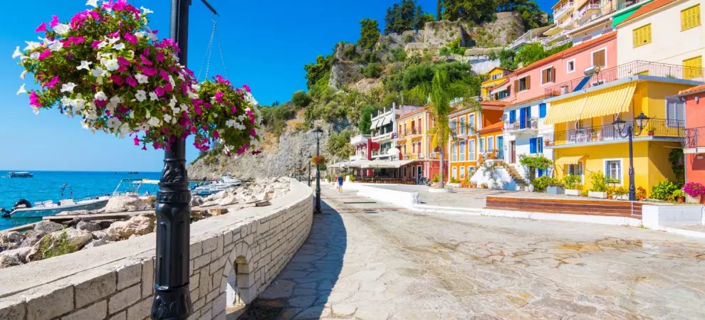 En by på Hellas vestre kyst, og kanskje det mest romantiske reisemålet av alle. Byen ligger som et amfiteater over havnen, og midt i byen har du to strender å velge mellom.